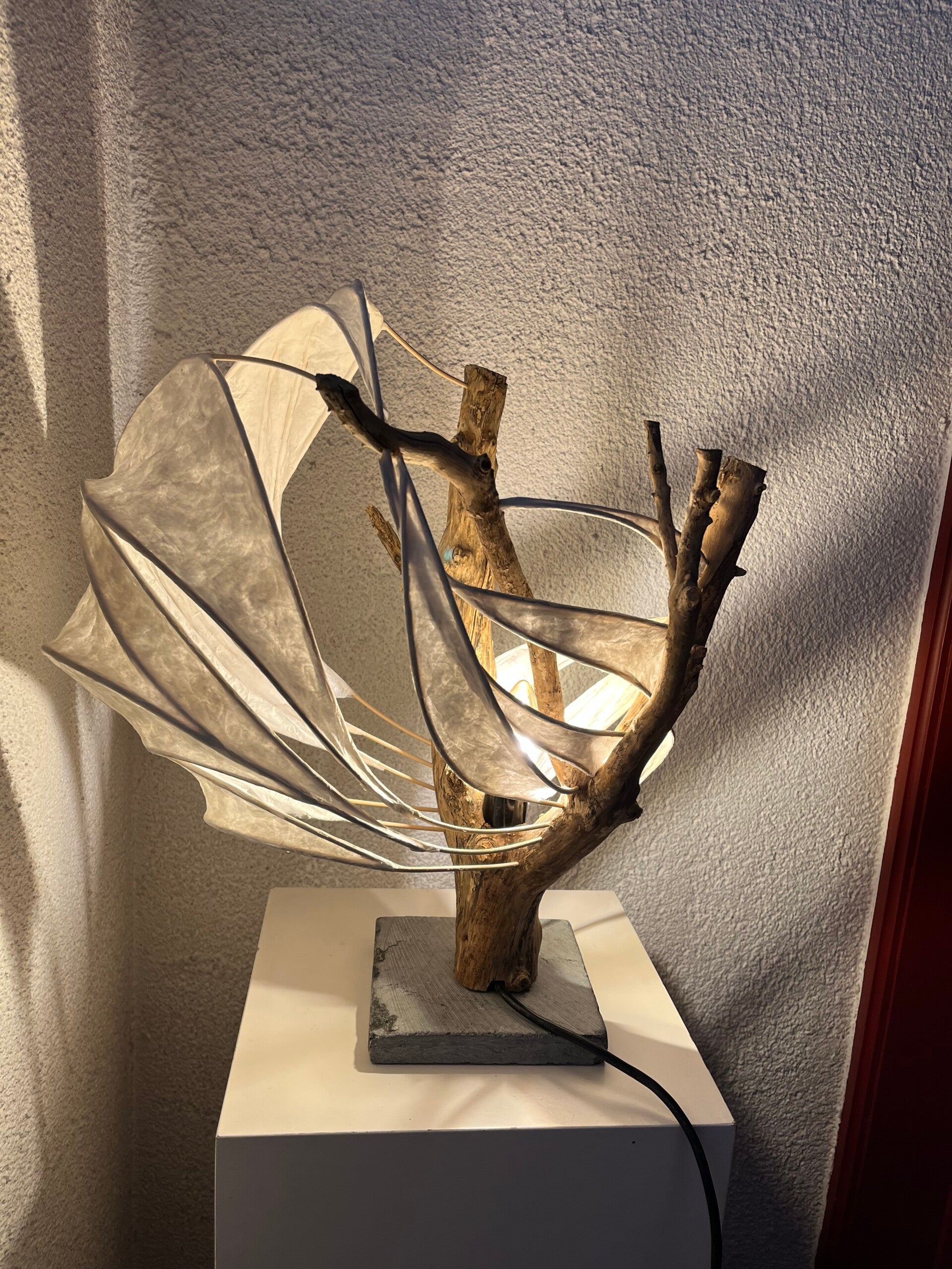 Staande lamp op natuursteen met snoer, stekker en schakelaar, warm licht. Gemaakt op takkenstructuur, ribben van pitriet en papier maché met wit bloemenpapier. Max breedte ca 40 cm, hoogte ca 45 cm.
